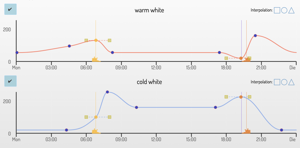 Ab UZSU Plugin Version 1.5.2 und smartVISU 2.9 Commit 5d15a36 (Stand Ende August 2018) gibt es eine neue Funktion im Universal Time Scheduler Plugin, mit der man eine Interpolation zwischen den angegebenen Zeitpunkten einstellen kann. Dies ist besonders nützlich, wenn Sie circadiane Lichtkurven für warmweißes und kaltweißes Licht programmieren möchten, kann aber auch für RGB-LEDs nützlich sein.